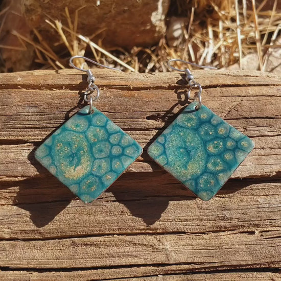Add a striking piece of colorful textured art to your outfit with these beautiful handmade copper enameled earrings. The deep teal tones are accented with light hints of beige/yellow/gold, creating a design that feels both organic and natural. The diamond-shape, and glossy glass finish catches the light, revealing subtle variations in pattern and tone.