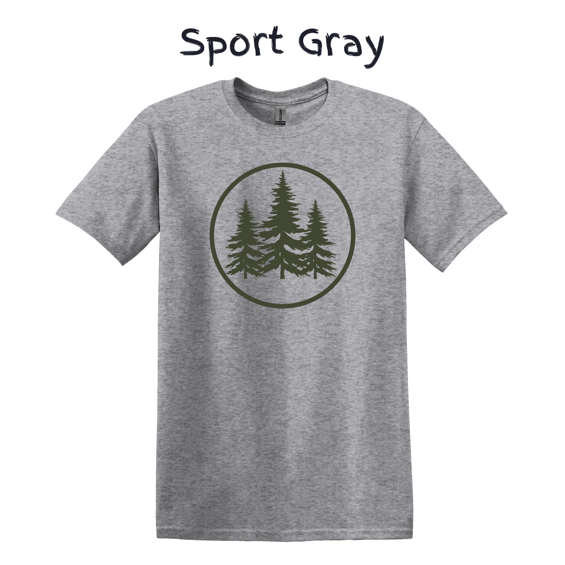 Men's Camping Shirt Graphic Tee Nature Hiking Shirt - Green Pine Forest Within a Circle