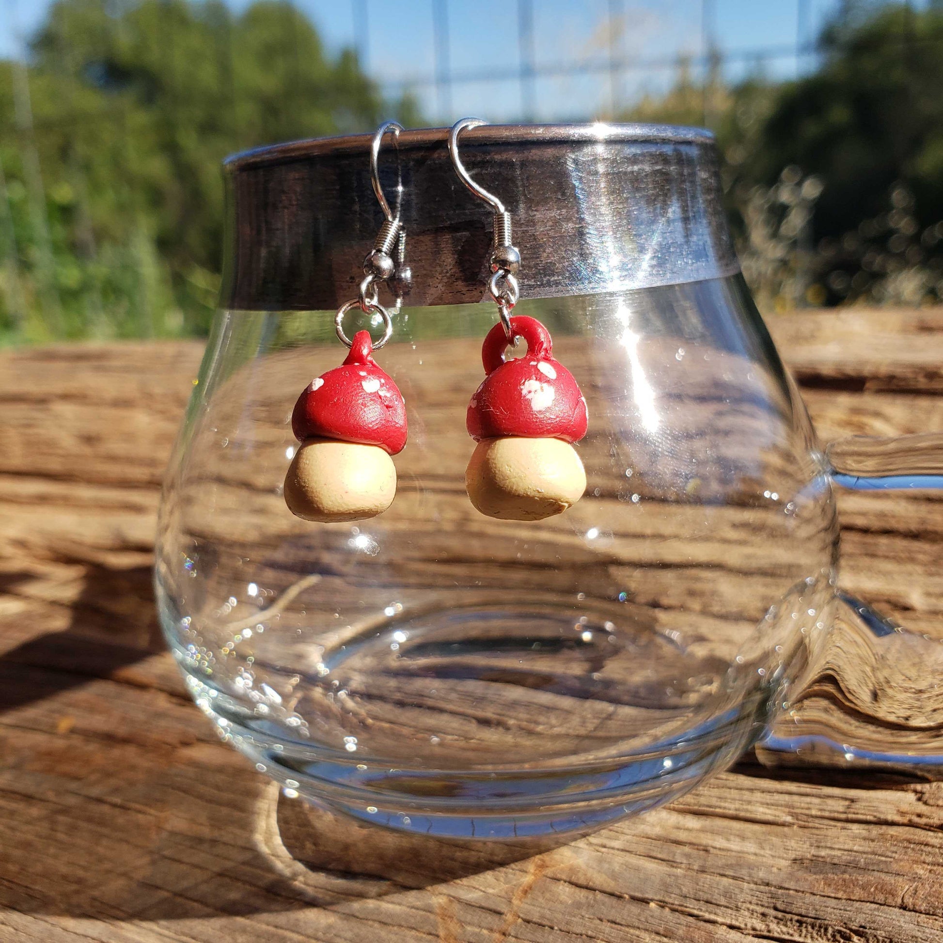 These whimsical mini mushroom earrings are handcrafted from polymer clay and designed to bring a touch of woodland magic to your style. Each earring features a beige stem topped with a vibrant red cap accented with tiny white dots, reminiscent of classic fairy-tale mushrooms. Lightweight and playful, they hang from simple fishhook ear wires, making them comfortable for everyday wear. With their charming, cottagecore-inspired aesthetic, these earrings are perfect for nature lovers, dreamers, and anyone who enjoys adding a bit of enchantment to their outfit.