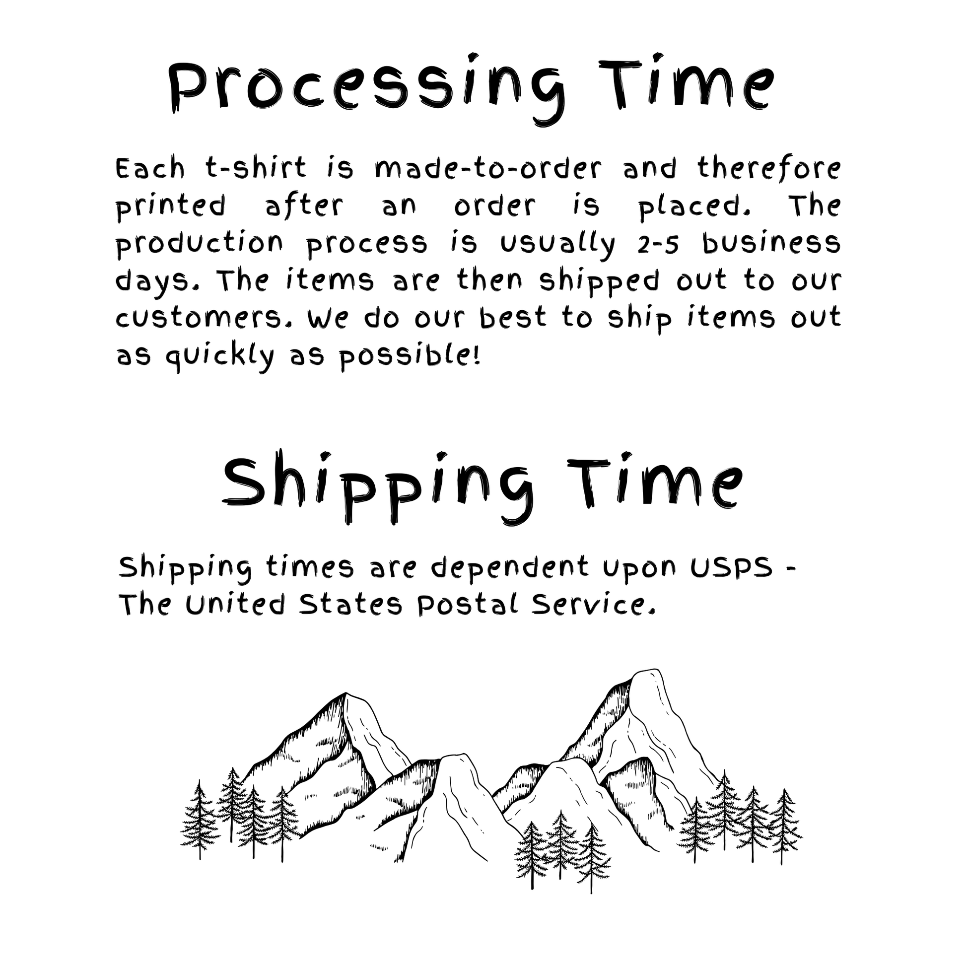 ** PRODUCTION / SHIPPING TIMES ** Each shirt is custom made-to-order and printed after an order is placed. The production process is usually 2-5 BUSINESS DAYS but may take longer. The items are then shipped to our customers. We cannot be held responsible for any lost, damaged, stolen or delayed packages once the shipping provider has your item. Please check with your local post office for any delays etc. during shipping.