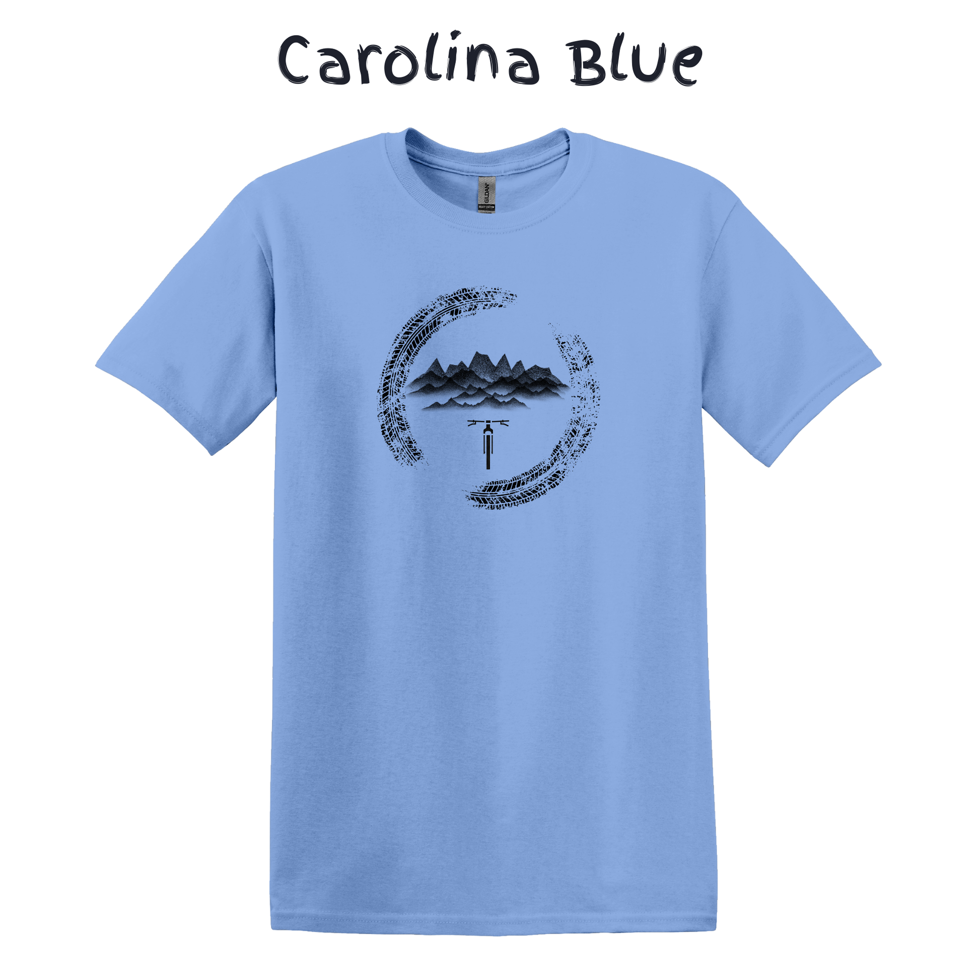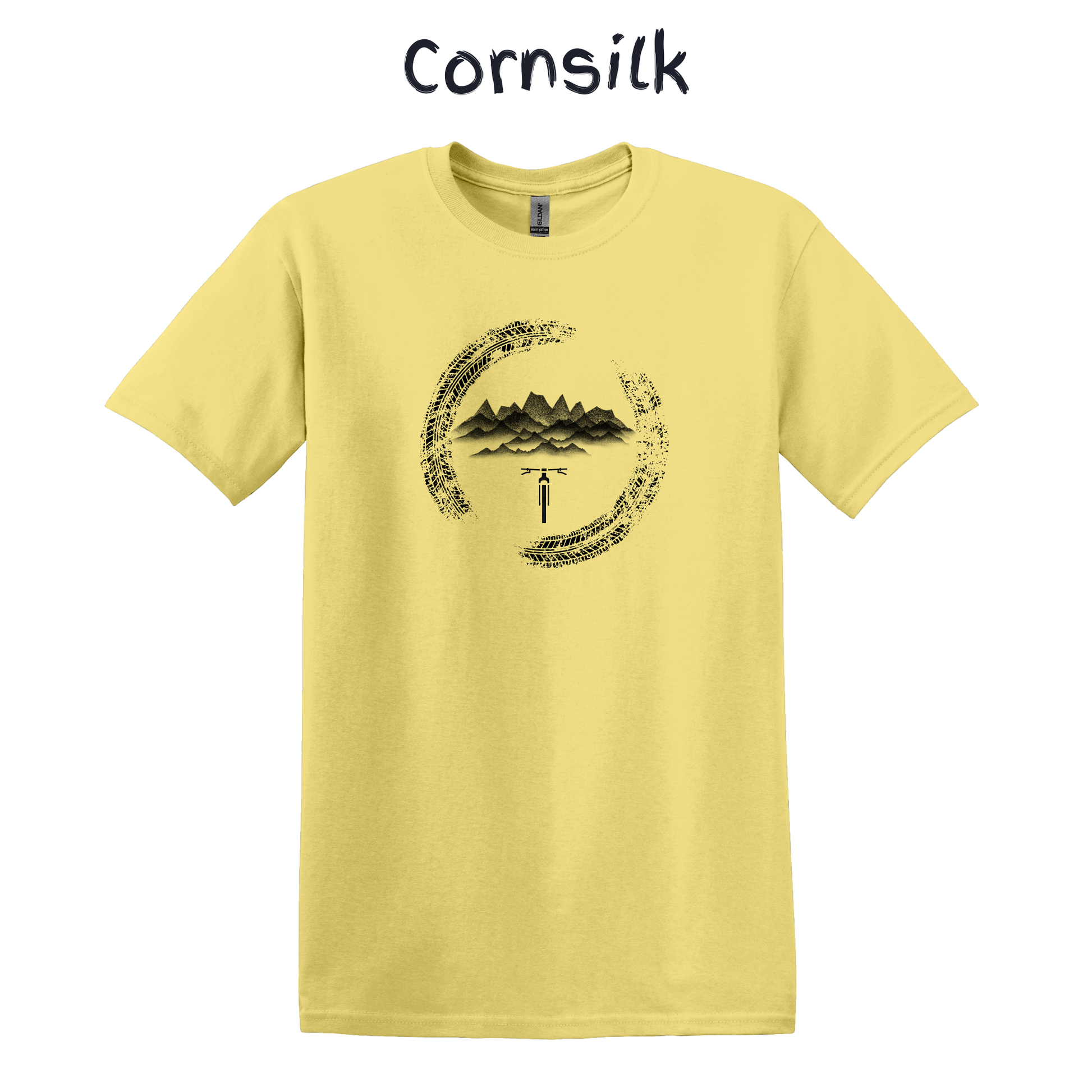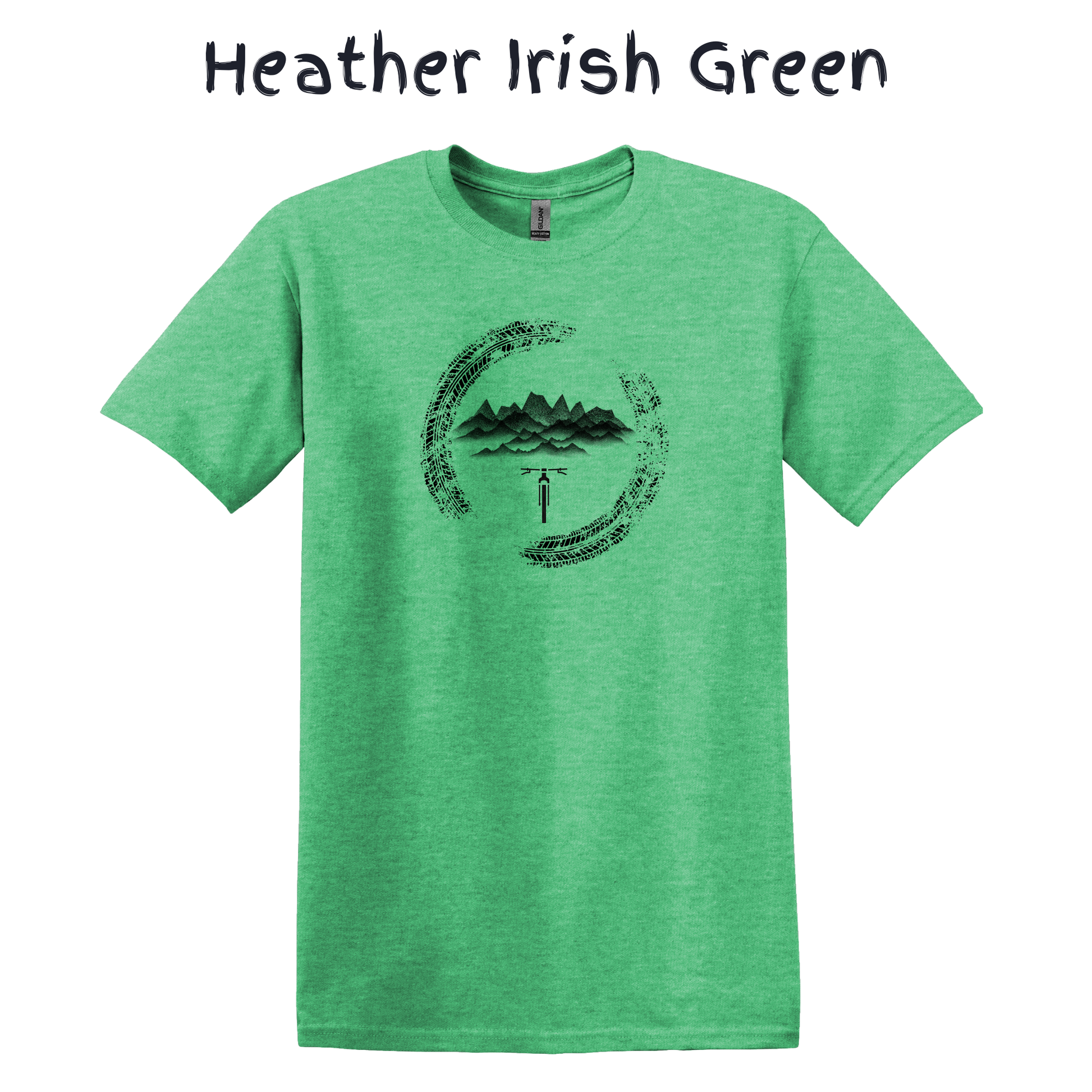 A men’s graphic T-shirt designed for riders who live for the trail. Centered on the chest is a bold circular graphic made from rugged mountain bike tire tracks, their tread marks forming a perfect ring. Inside the circle sits a striking mountain range, with sharp peaks and layered ridgelines that suggest elevation, challenge, and wide-open terrain. The distressed texture of the tire tracks gives the design a worn-in, authentic feel, while the mountains symbolize exploration and freedom.