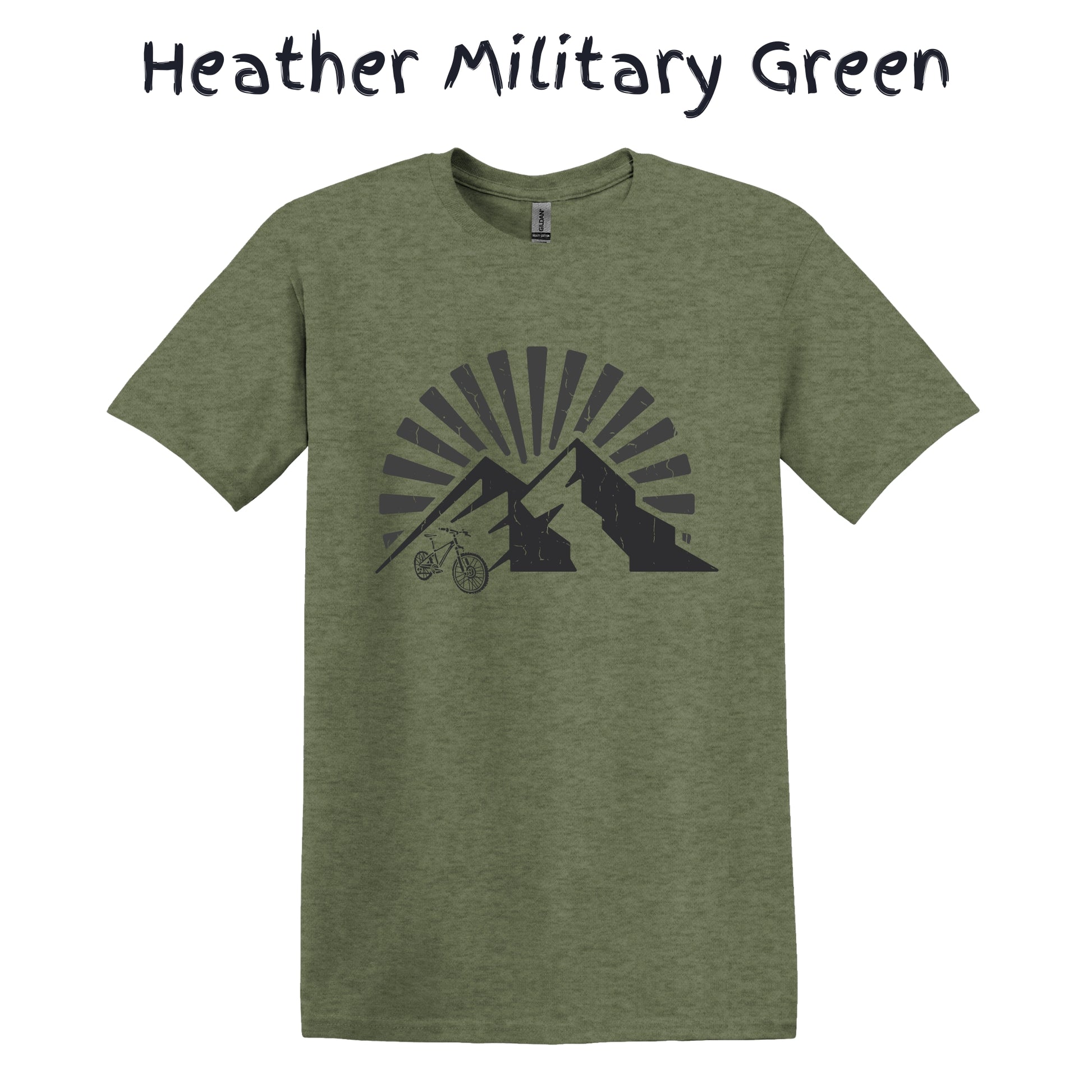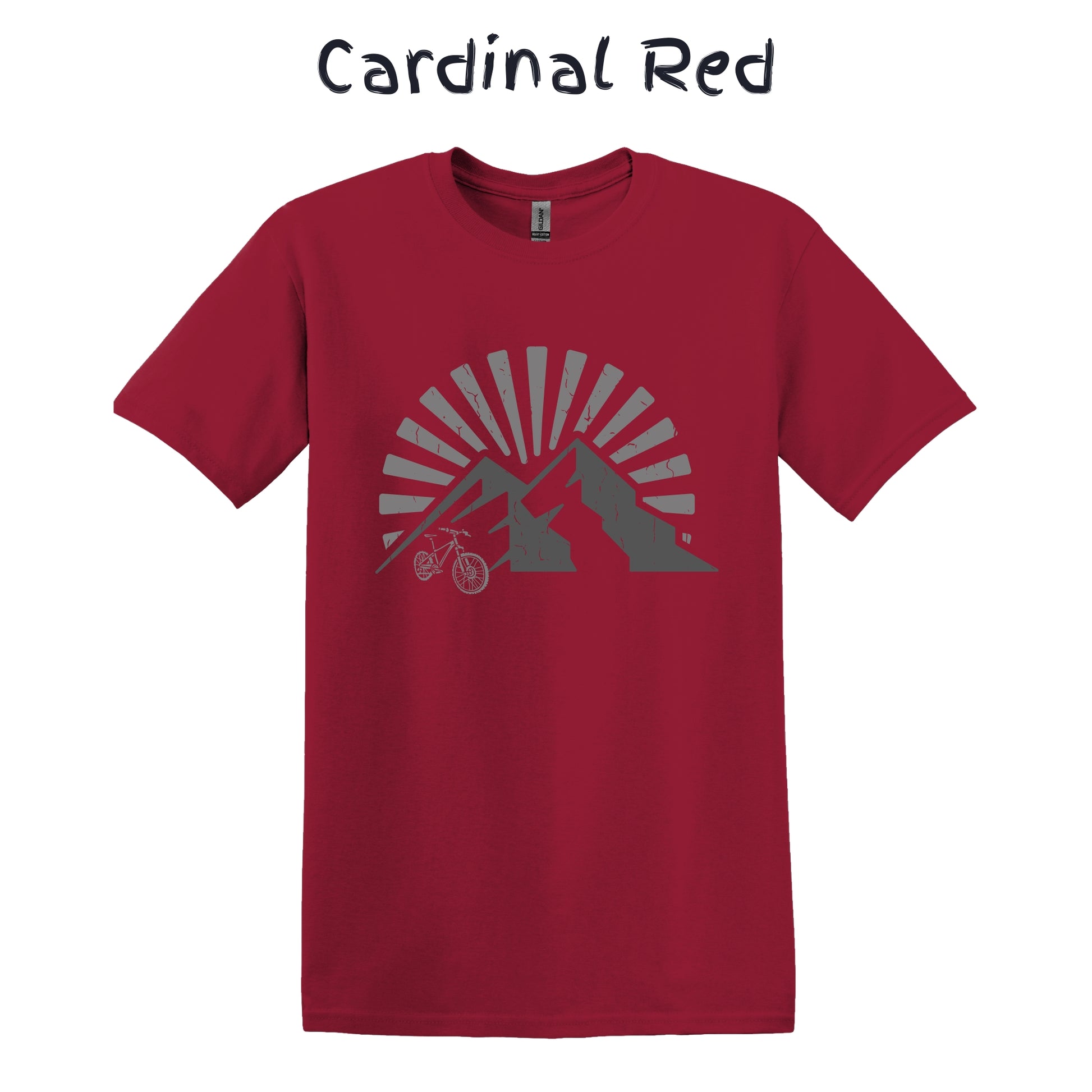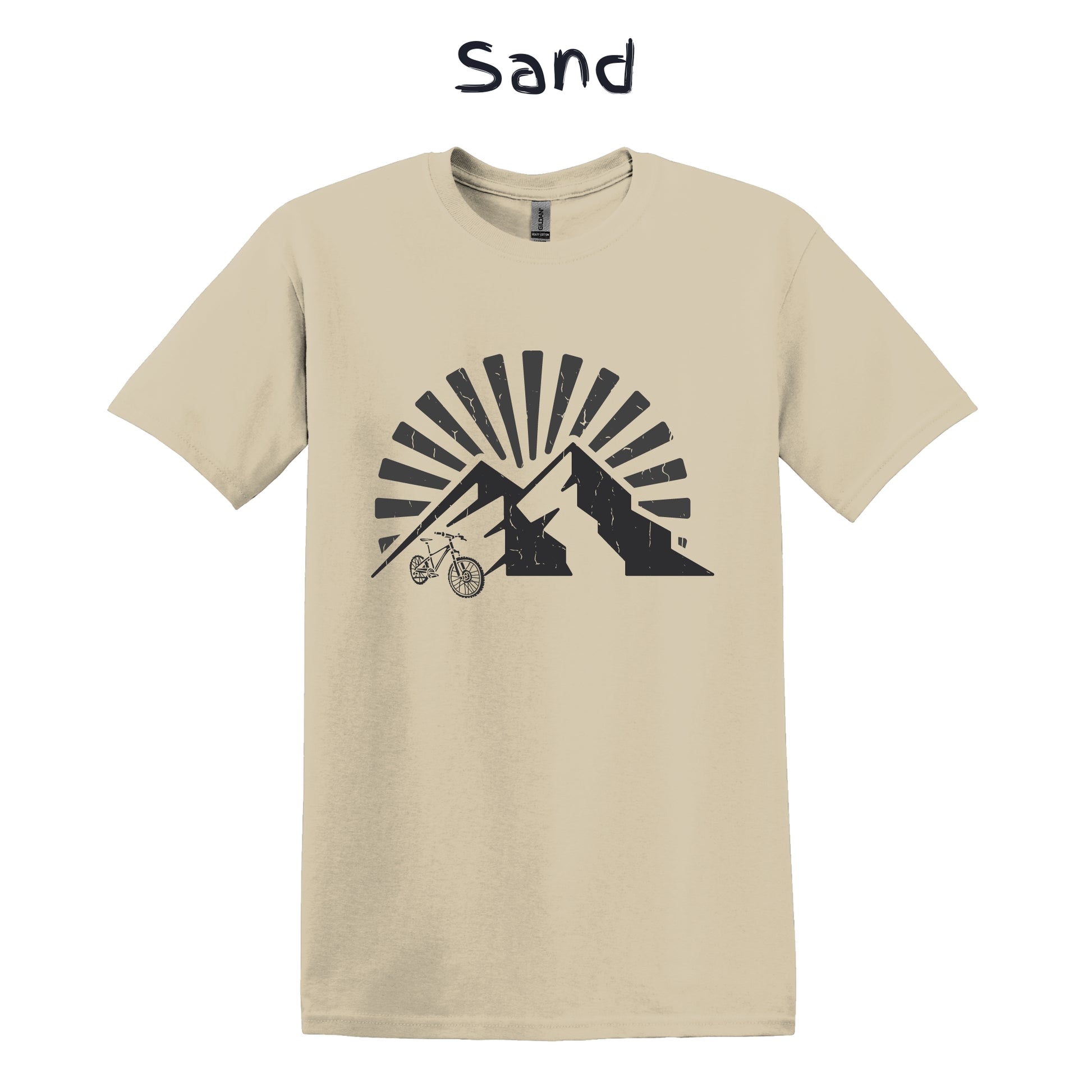 Mountain Bike T-Shirt MTB Biker Biking Shirt Adventure TShirt Cycling - Gray Bike in Front of Mountain