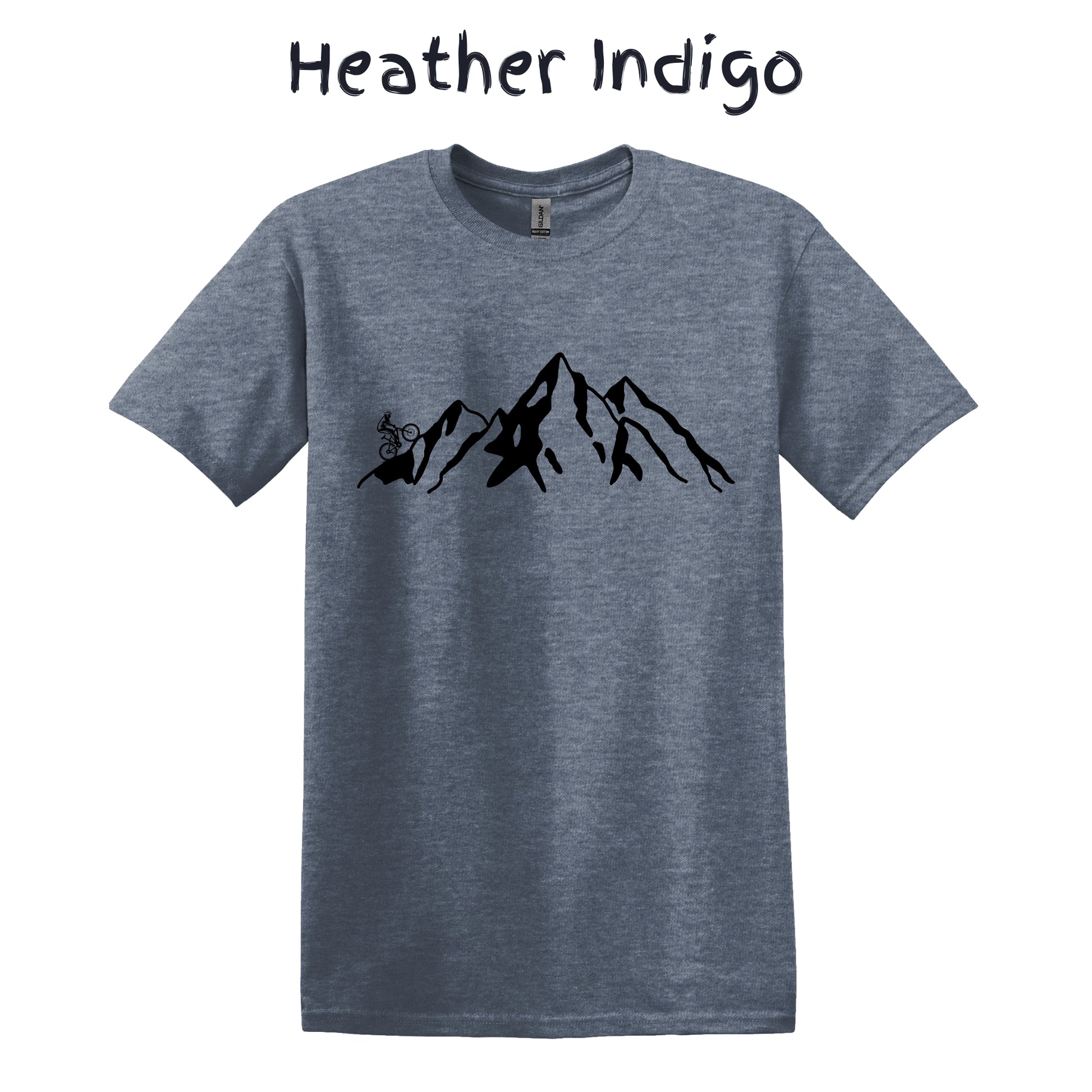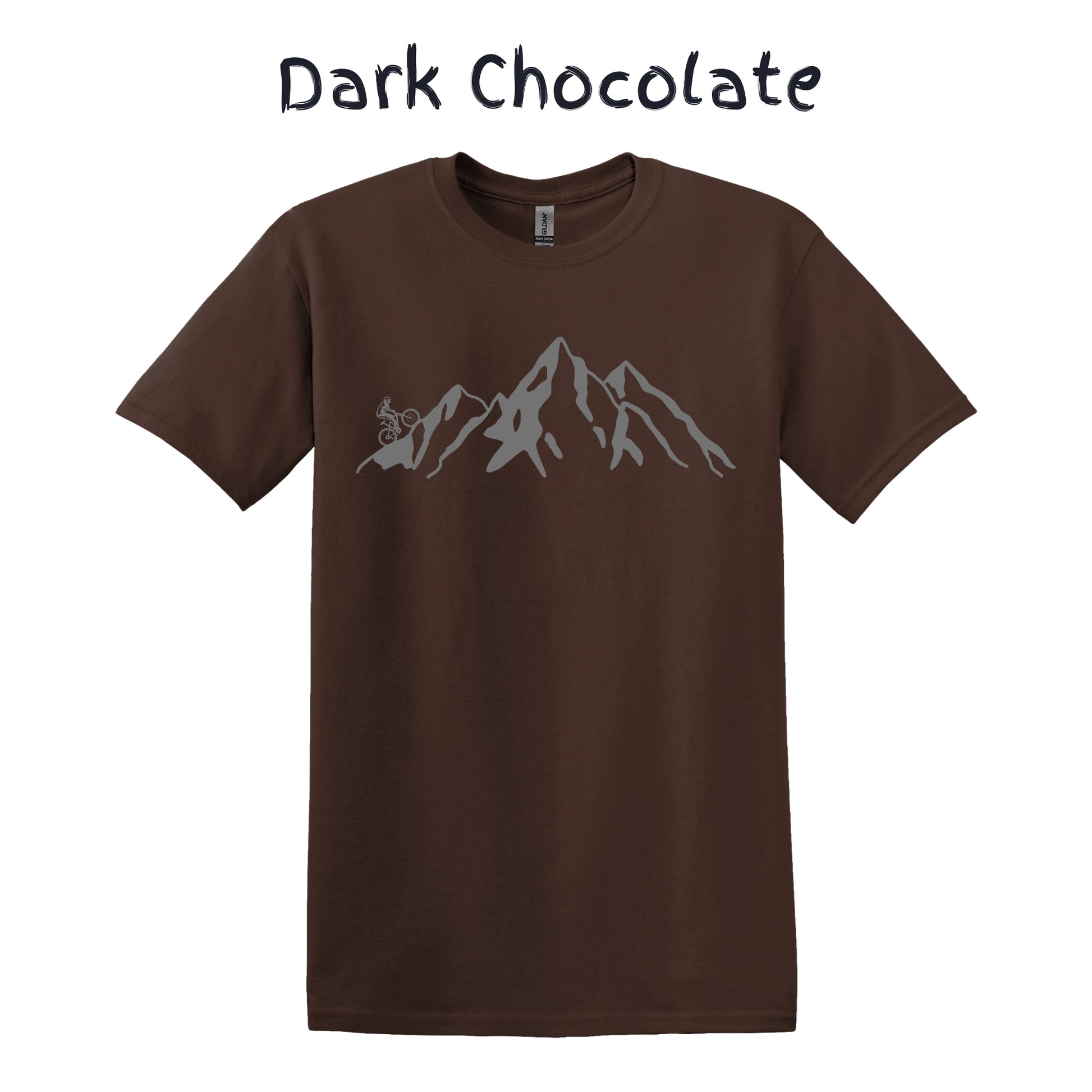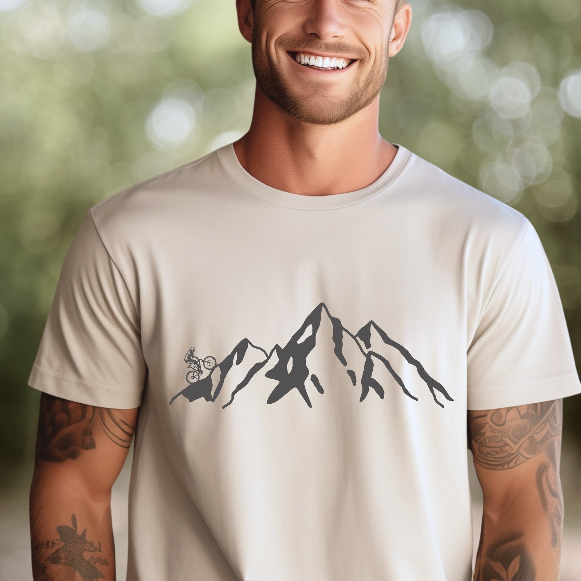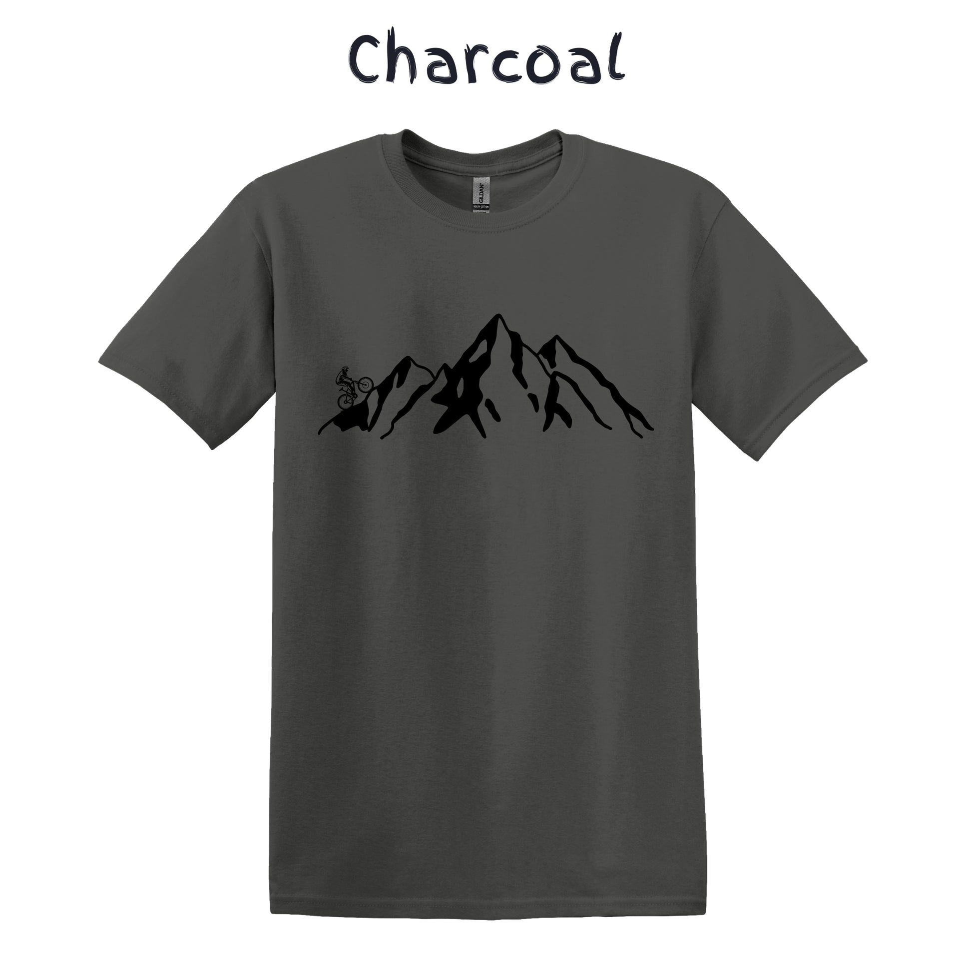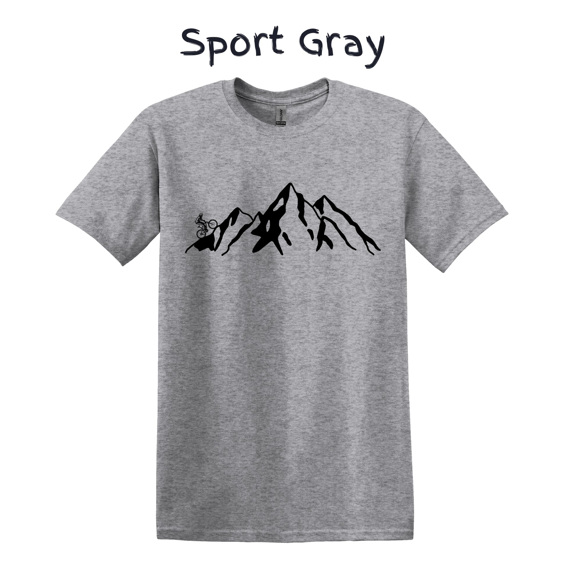 Mountain Bike TShirt Biker MTB Men Biking Bicycle Cycling - Grey Mountain Range with Biker on Left
