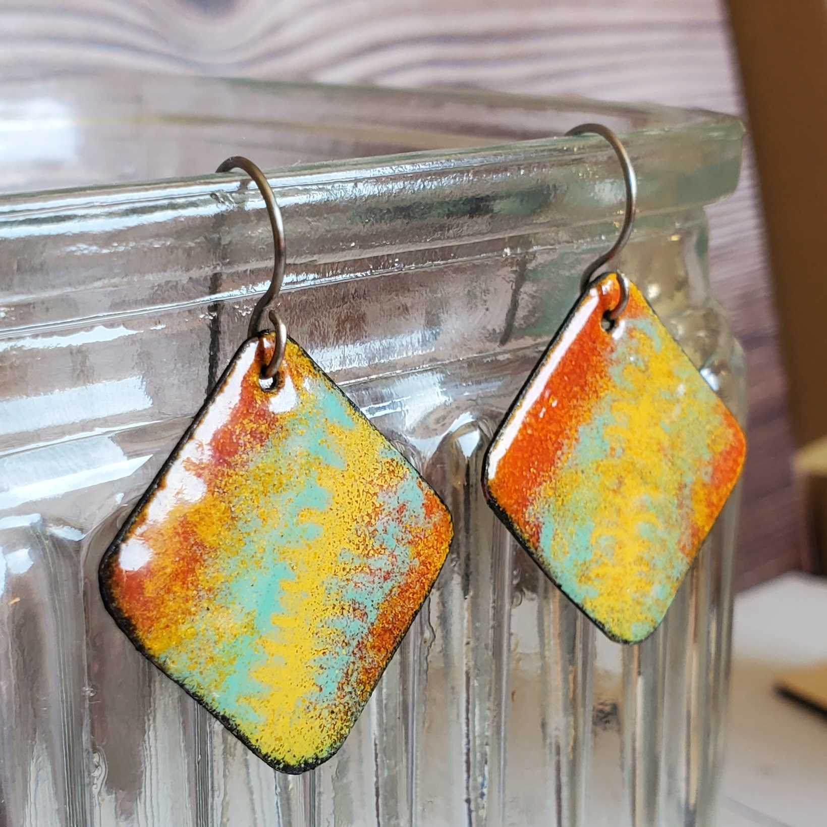 Natural Boho Dangle Earrings Enameled Copper Mint Green Orange Yellow Fern Like Pattern