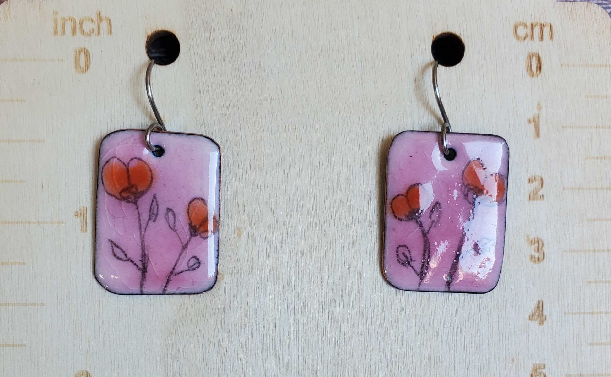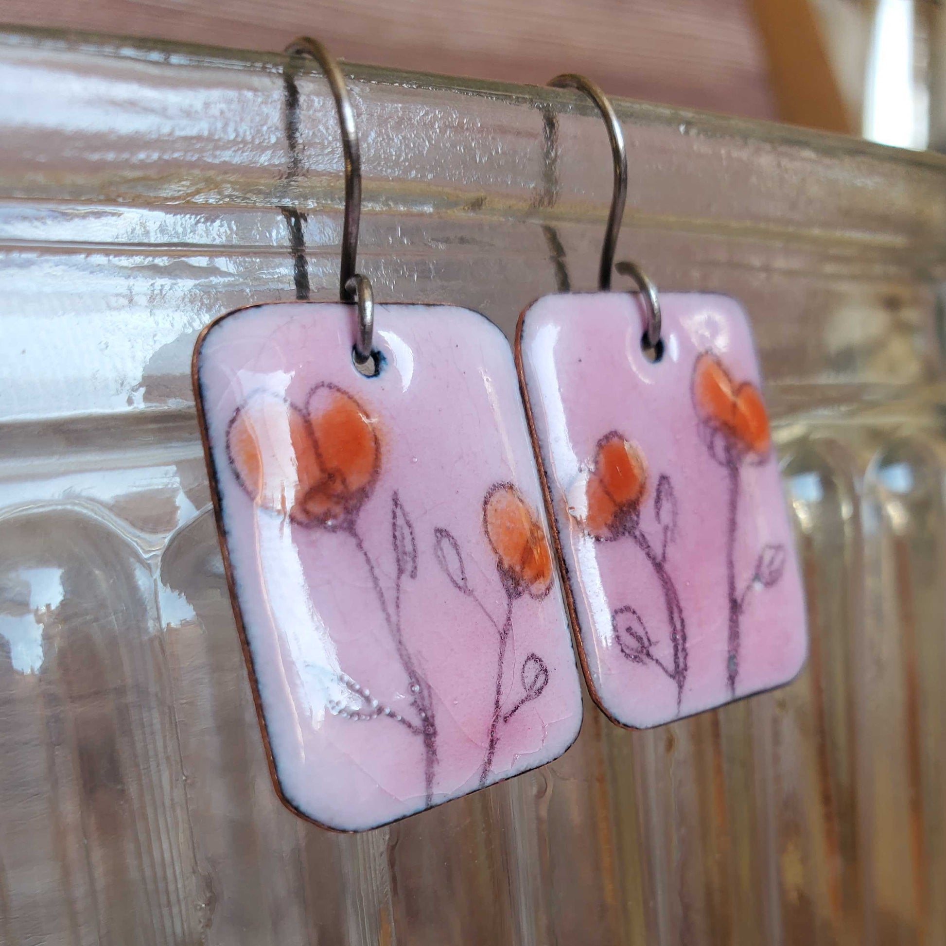 These small rectangle-shaped copper earrings glow with a soft light pink base, accented by two delicate orange-pink flowers. Their glossy fired finish brings out the warmth and charm of the floral design, making each pair uniquely handmade. These small dangle earrings offer a sweet boho touch that’s perfect for everyday wear or adding a hint of artistry to your style.