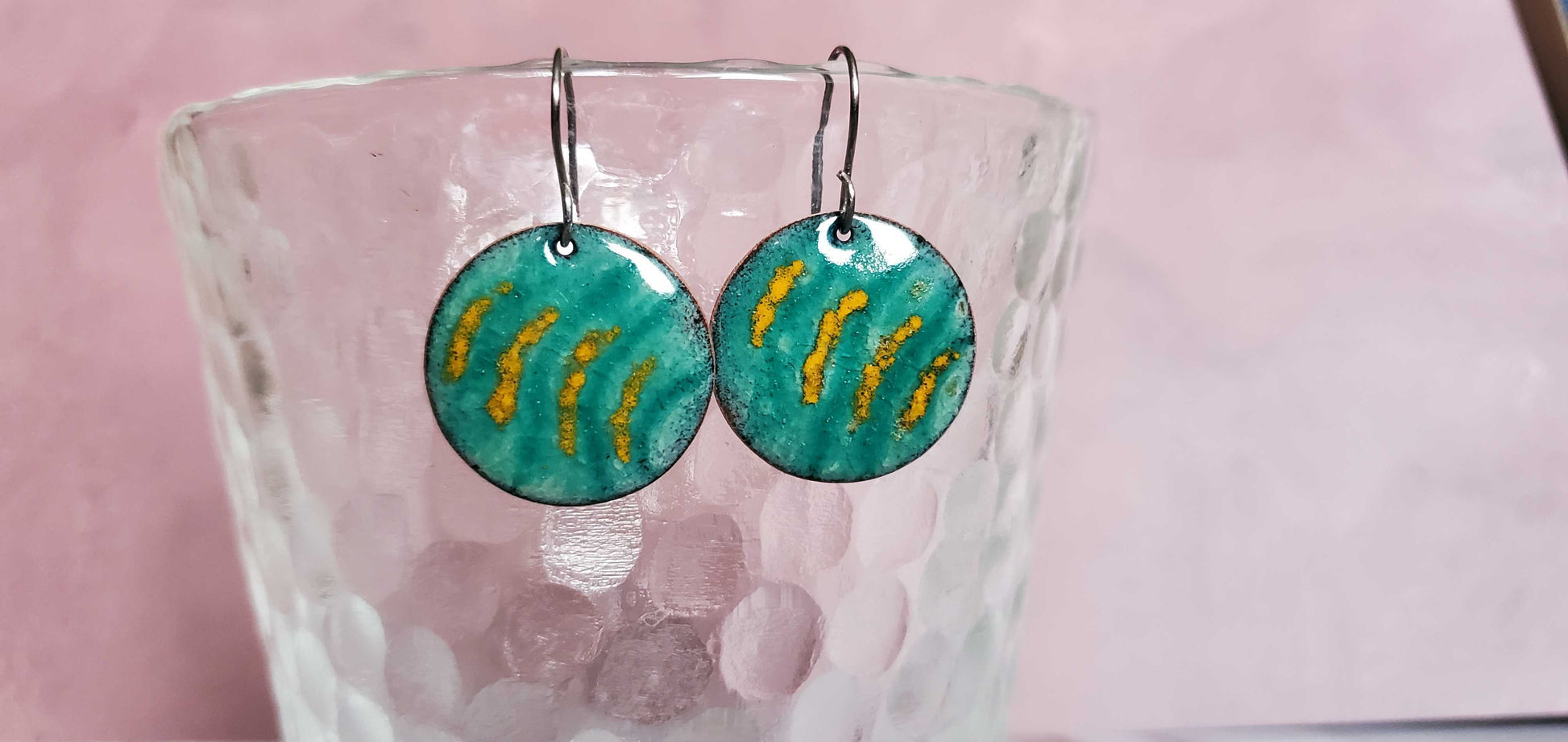 These small circle copper earrings are kiln-fired with layers of glass in a playful turquoise and yellow striped pattern. The glossy finish enhances their vibrant colors, giving them a cheerful, eye-catching look. Lightweight and fun to wear, these dangly earrings bring a bright pop of boho charm to any outfit.