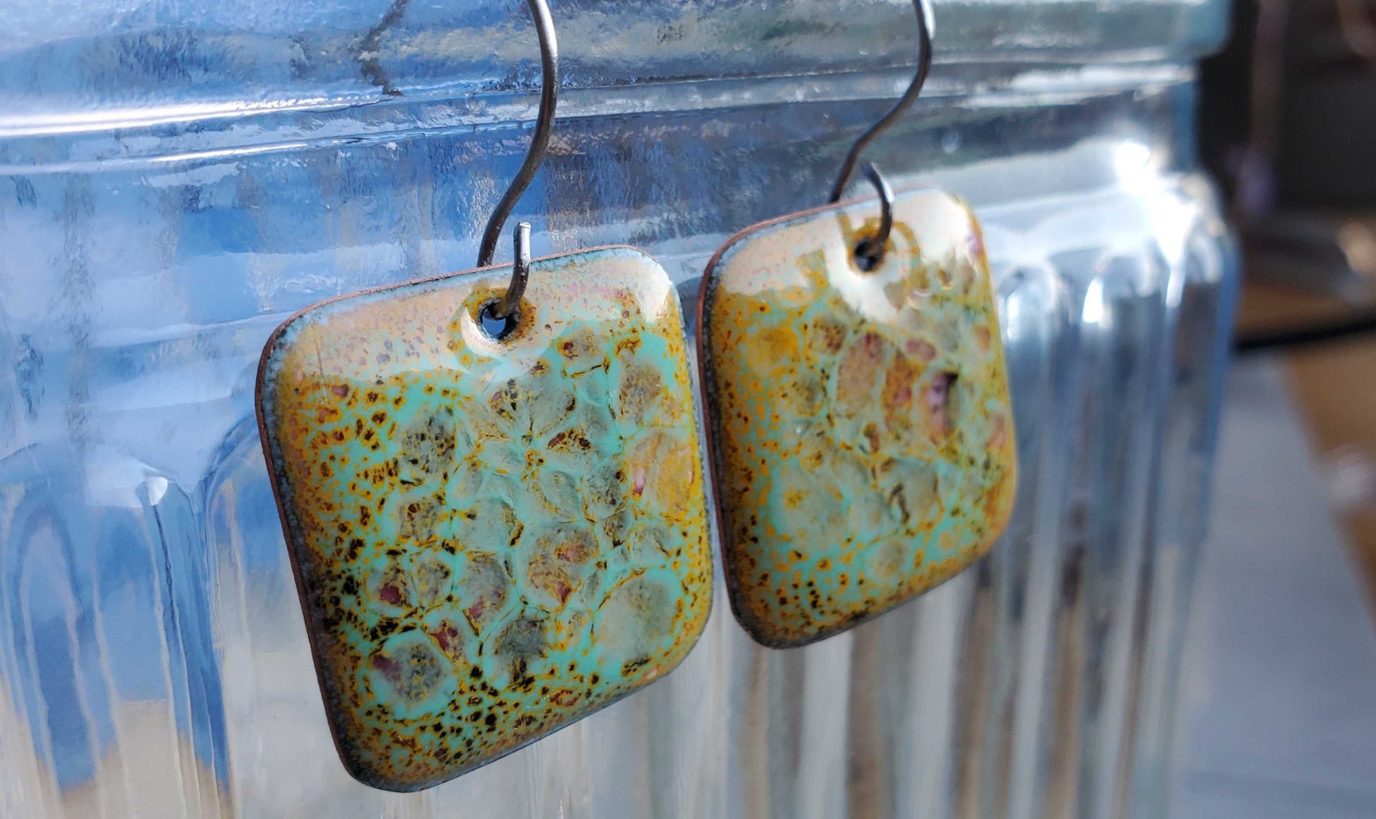 These copper earrings undergo numerous firings and layers of color to get the end product in the photos. You will receive the earrings in the photo.